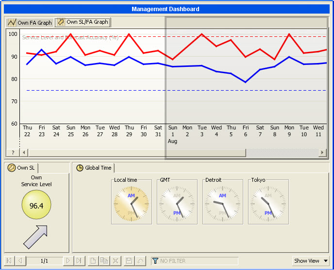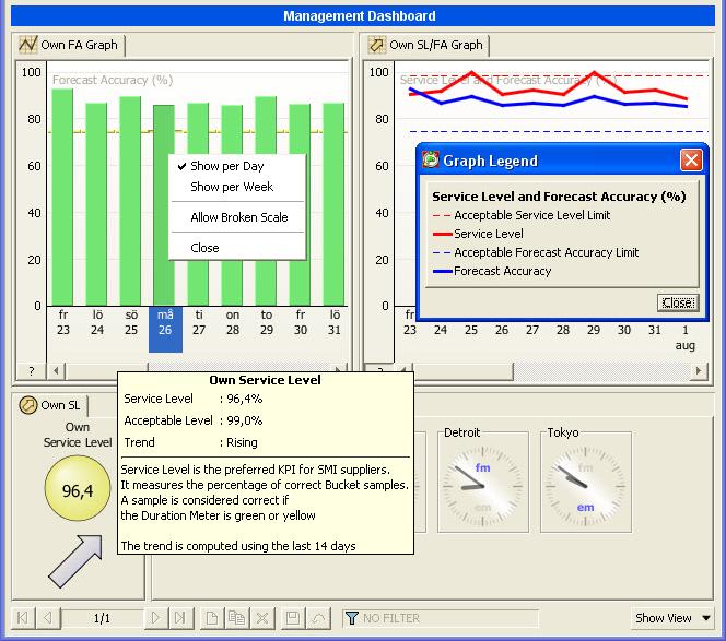 The Own SL/FA Graph view shows how the inbound Service Level and Forecast Accuracy VMI KPIs correlate. There is also a Cust SL/FA Graph that provides the same information for the outbound side. The resolution is week or one day. Note that in this view, this is ONLY a resolution change. The graph range is the maximum of the Service Level graph range and the Forecast Accuracy VMI graph range.