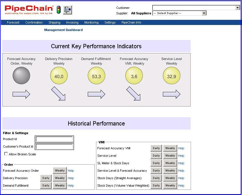 Most views in the Dashboard are affected by the PipeChain Filter Settings Supplier Id, Supplier Group, Customer Id, Customer Group, Product Id and Product Group.